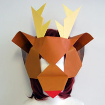 A4サイズでプリント、カットして、平面的に貼り合わすだけで、このような立体的で迫力あるかぶりものが、一般の人でも簡単に作れるようにデザインしています。